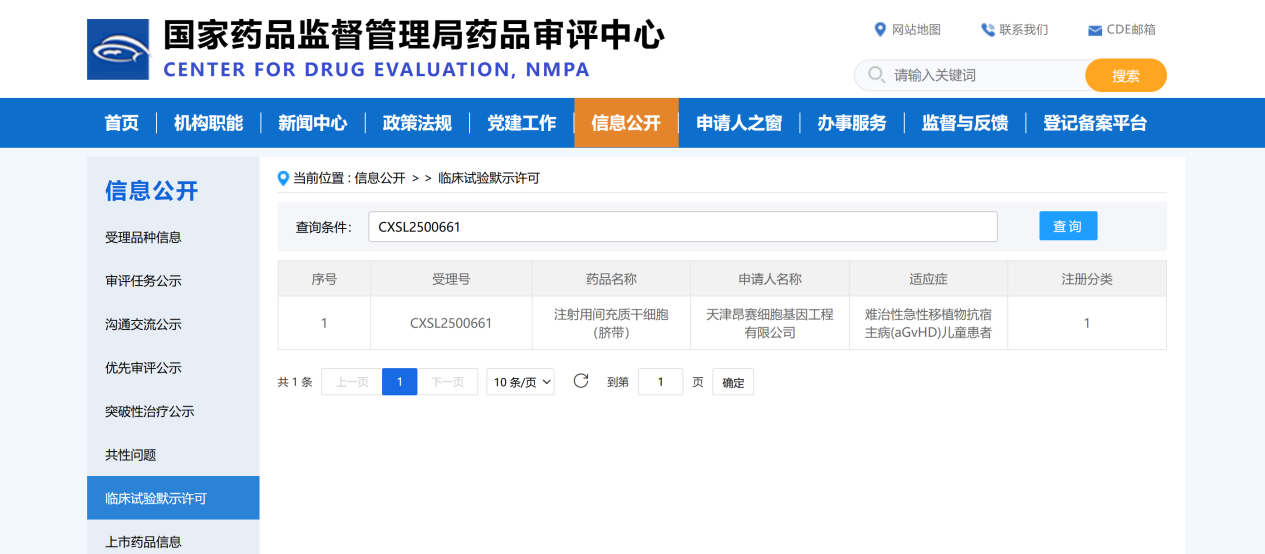 2025年11月3日, 天津昂賽細(xì)胞基因工程有限公司申報(bào)的注射用間充質(zhì)干細(xì)胞(臍帶)治療難治性急性移植物抗宿主病(aGvHD)兒童患者的適應(yīng)癥獲得國家藥品監(jiān)督管理局臨床試驗(yàn)?zāi)驹S可